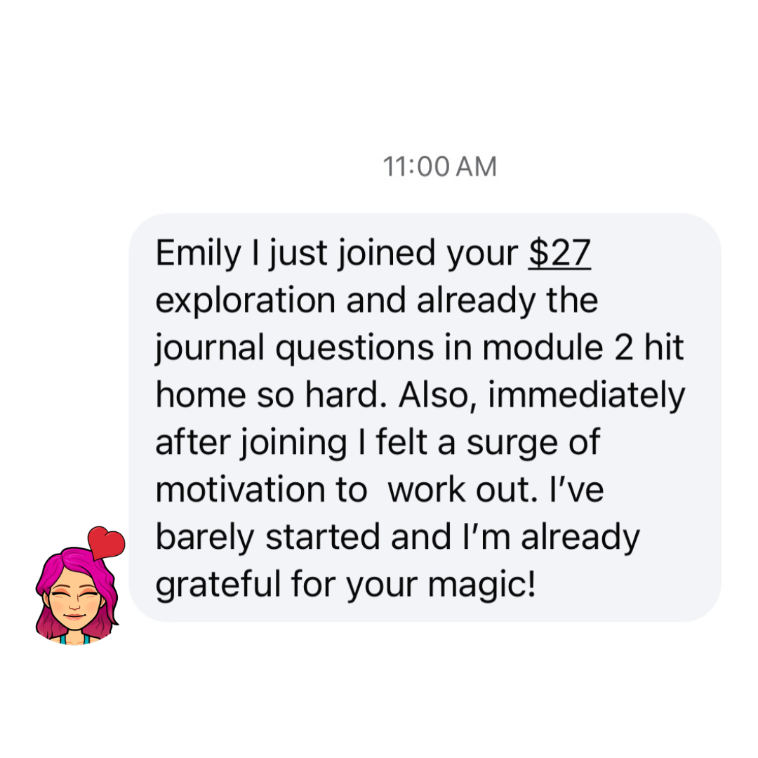 When you finish the short 6 mini modules you'll be able to schedule your bonus 1:1 call with Emily where she will lead you through either the pain consciousness tool to uncover the subconscious reason behind your pain (& immediately start to reduce it!) or the cravings consciousness tool to identify the subconscious unmet need behind one of your cravings so you can start to release it.