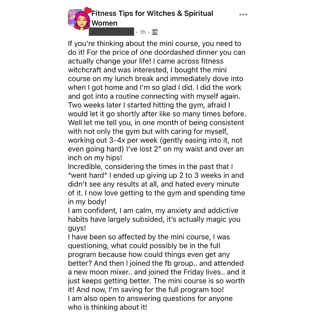- BONUS access to the brand new Fitness Witchcraft Coven which is an alumni space with free bonus trainings & events