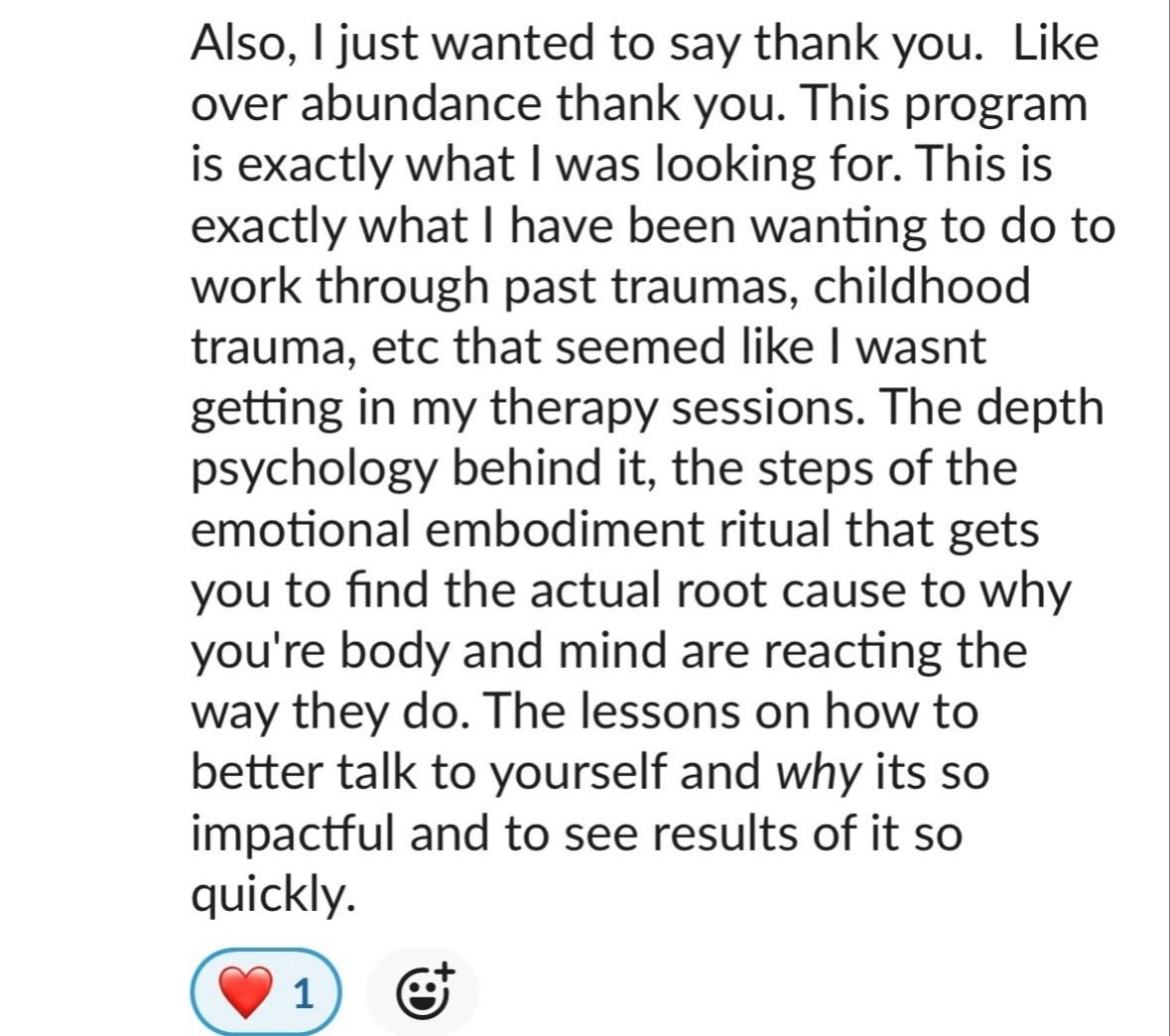 This is your exclusive opportunity to gain insights into my personal journey of going from narcissistic abuse & CPTSD… to becoming a more grounded human than ever & building a multiple 6 figure business. You’ll discover the thoughts, beliefs, fears, rituals, & tools I used at each phase of my journey. Get ready for a full transparency road map.